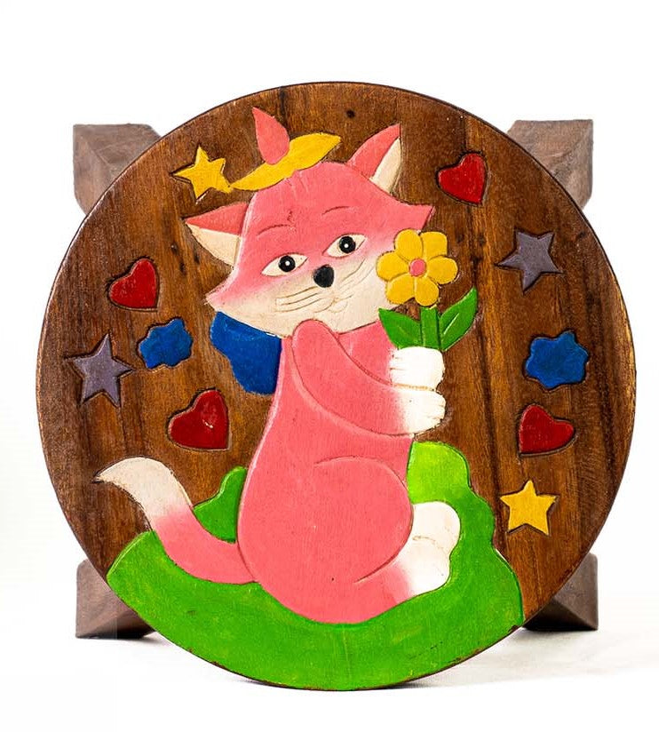 Tritthocker für Kinder – runder Kinderhocker – Pflanzenständer für den Innenbereich – Melkhocker – Heimdekoration, Holztritt, Massivholzhocker bemalt und geschnitzt mit Tiermotiv